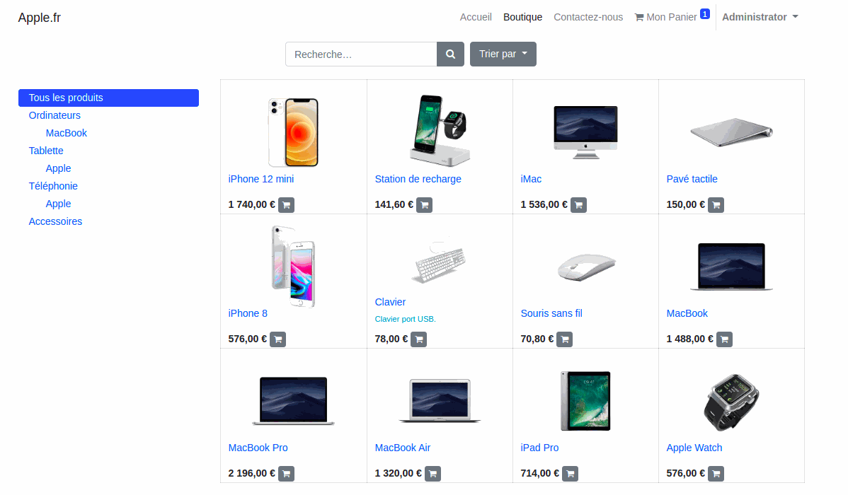 Présentation des produits sur le site par catégories spécifiques, recherches par nom ou caractéristiques de produit.